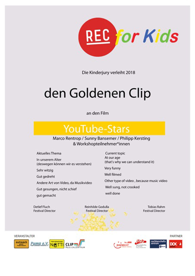 Hui… Schon wieder ein Preis für ein Projekt von Freigesprochen Mediencoaching! Beim REC for Kids- Filmfestival in Berlin haben für unsere Musikparodie „YouTube- Stars“, die im Rahmen eines Kulturrucksack- Workshops im Sommer 2017, unter der Leitung von Sunny Bansemer, Marco Rentrop & Philipp Kersting in Krefeld entstanden ist, den „Goldenen Clip“ und ein Preisgeld von 500€ gewonnen.