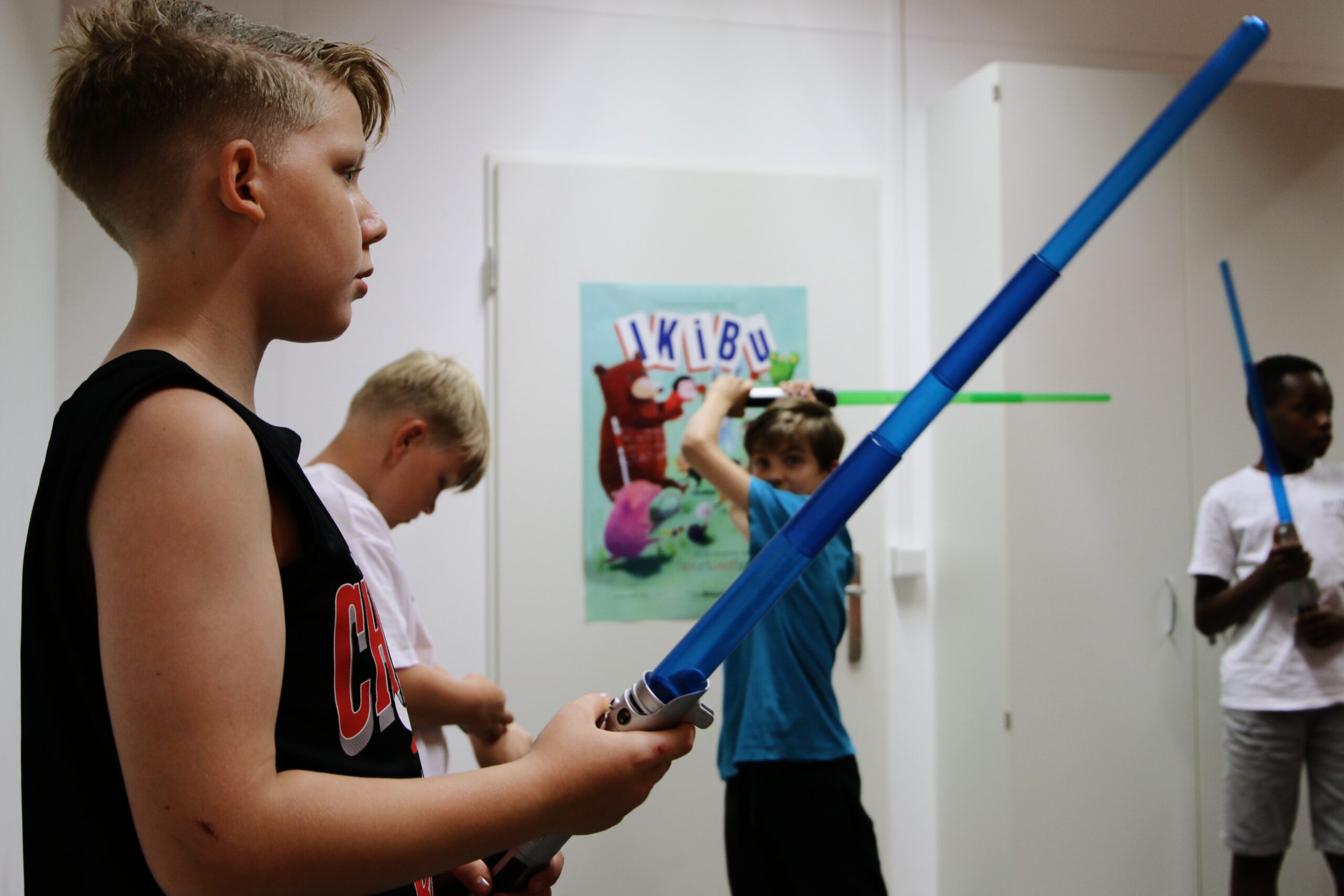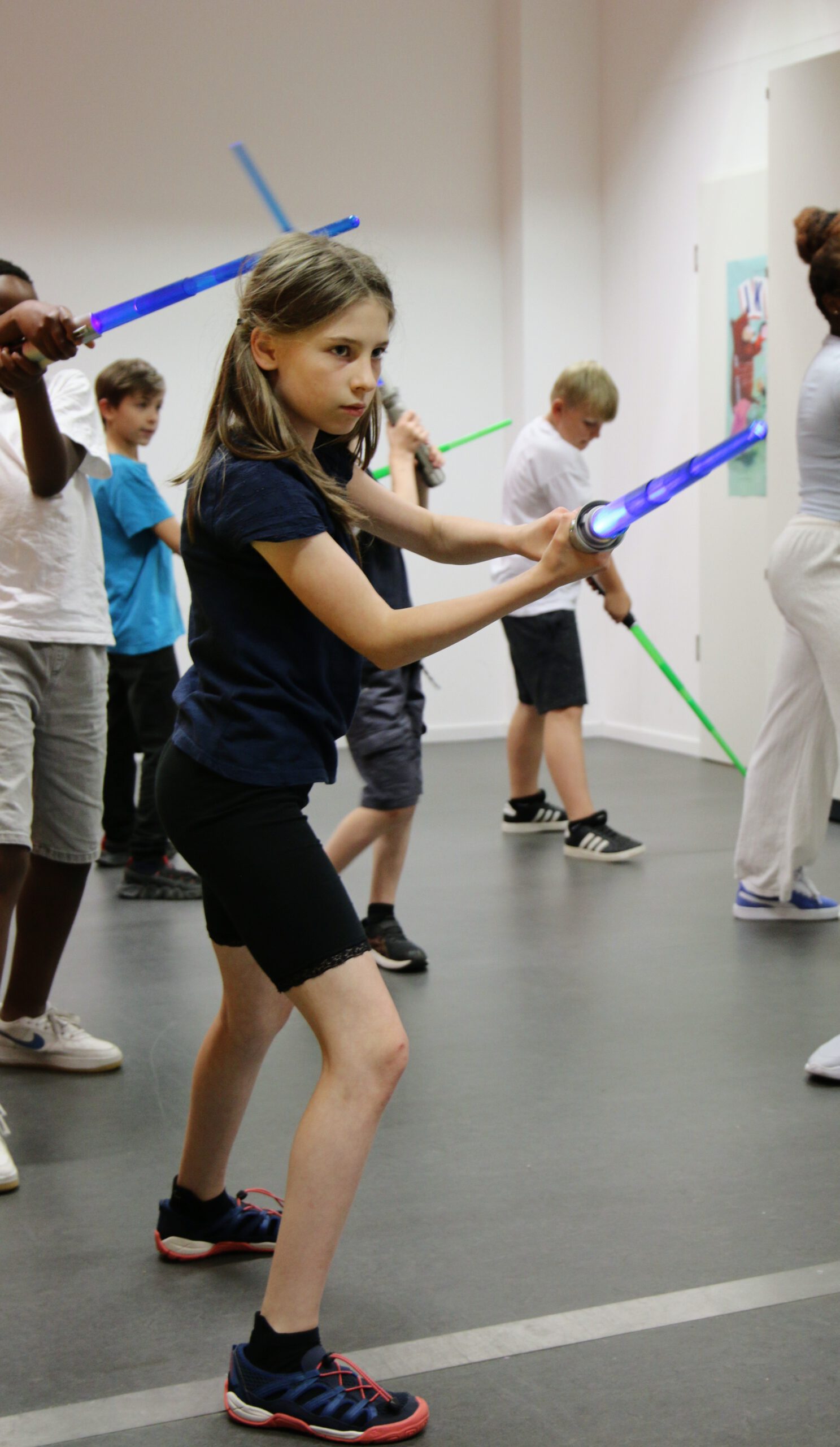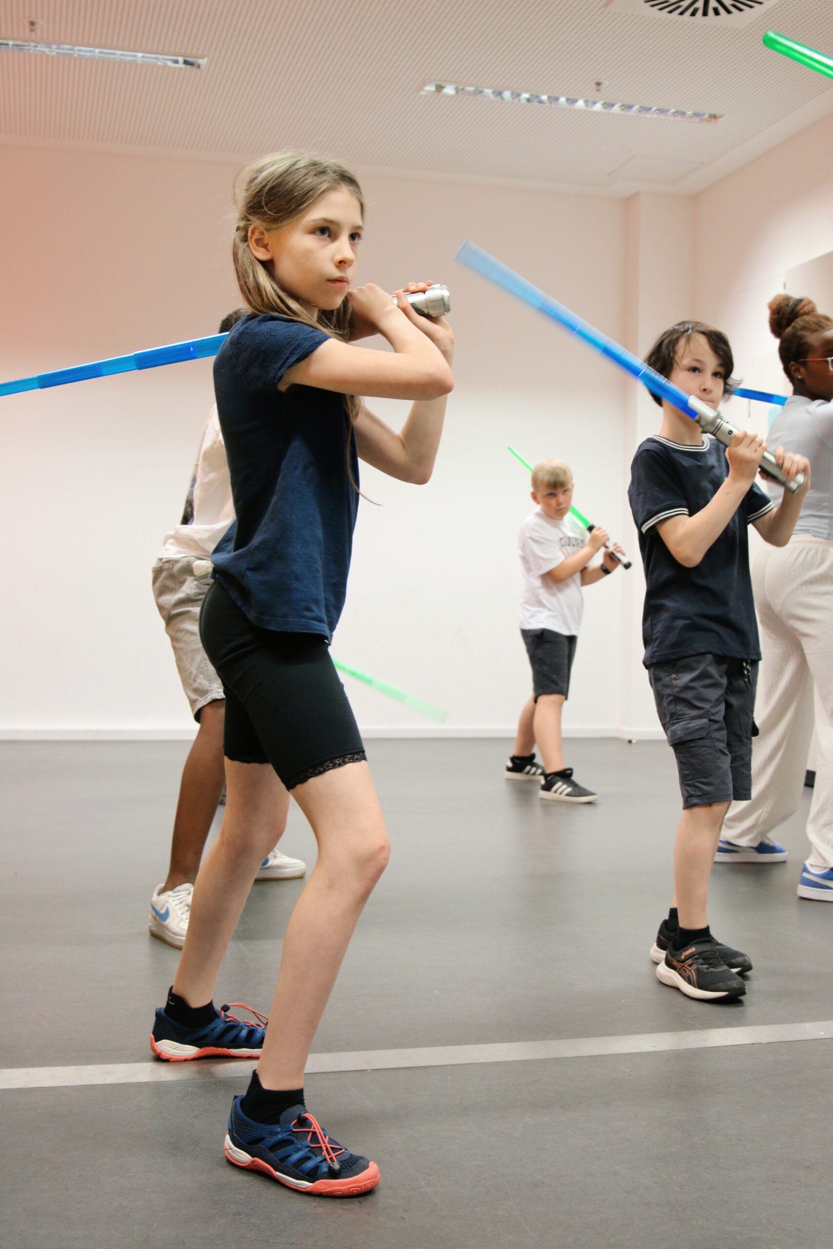 Unter der Leitung von Fechttrainer Olaf Küppers und Schauspielerin Sunny Bansemer lernten die Teilnehmenden die Grundlagen des sicheren Schwertkampfs – ob mit Lichtschwert wie ein Jedi oder mit Degen wie ein Musketier. Nach intensiven Übungseinheiten entwickelten die jungen Teilnehmer eigene Kampf-Choreografien, die sie anschließend mit dem Smartphone filmisch in Szene setzten.